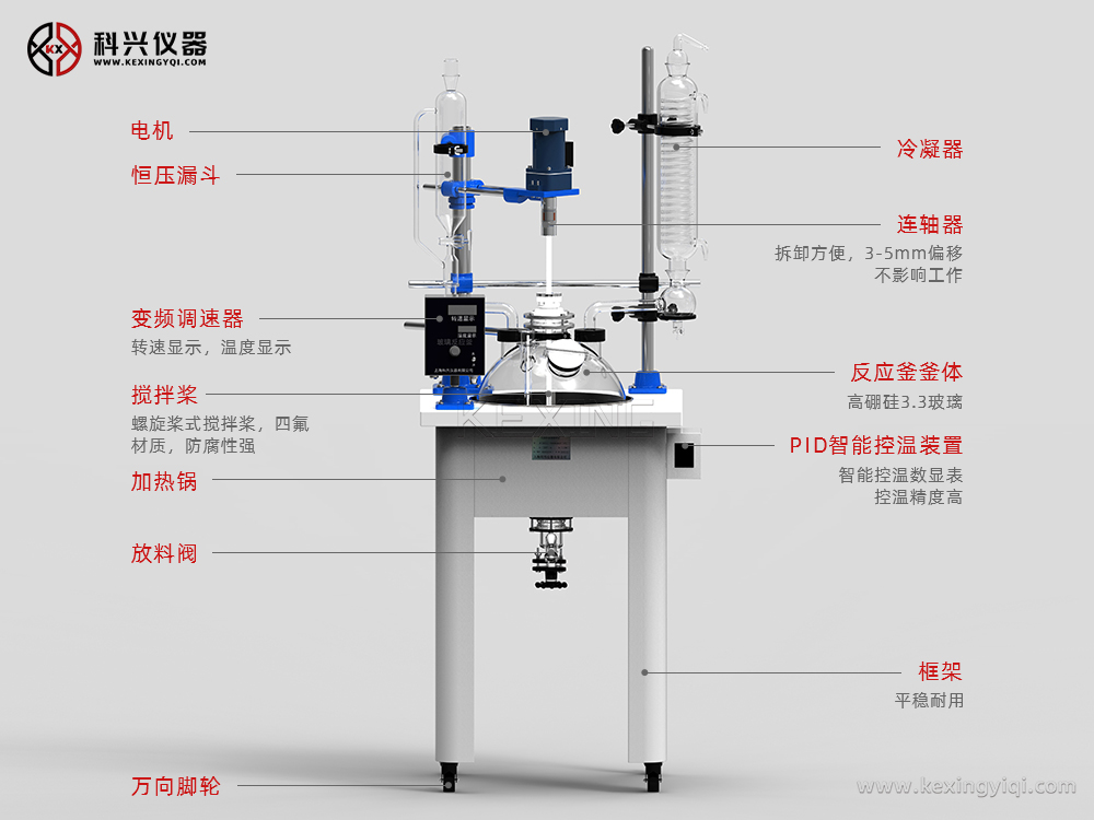 該系列反應釜是我公司根據客戶實際需要及規定標準的新型單層玻璃反應釜,其吸收了國內外同類產品的優點,同時大膽創新,不僅使用方便(可一人方便移動,操作,清洗,安裝,拆卸),而且結構新穎實用,外形美觀大方;誠為現代化學,精細化工,生物制藥,新材料合成等試驗及生產的理想設備。該反應釜工作原理:玻璃反應釜內放反應物料,同時可抽真空做攪拌反應;外部水(油)浴鍋可加水或加熱油進行加熱反應;并能控制反應溶液的蒸發和回流,恒壓加料等功能。(可選配制冷組件,配合制冷源進行低溫反應)